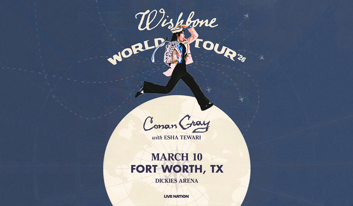 Multi-platinum singer-songwriter Conan Gray has announced his highly anticipated 2026 Wishbone World Tour with special guest Esha Tewari, in support of his critically acclaimed fourth studio album Wishbone (Republic Records). The 42-city global run will make a stop in Fort Worth at Dickies Arena on March 10. The tour will showcase support from rising pop artist Esha Tewari across all dates.
